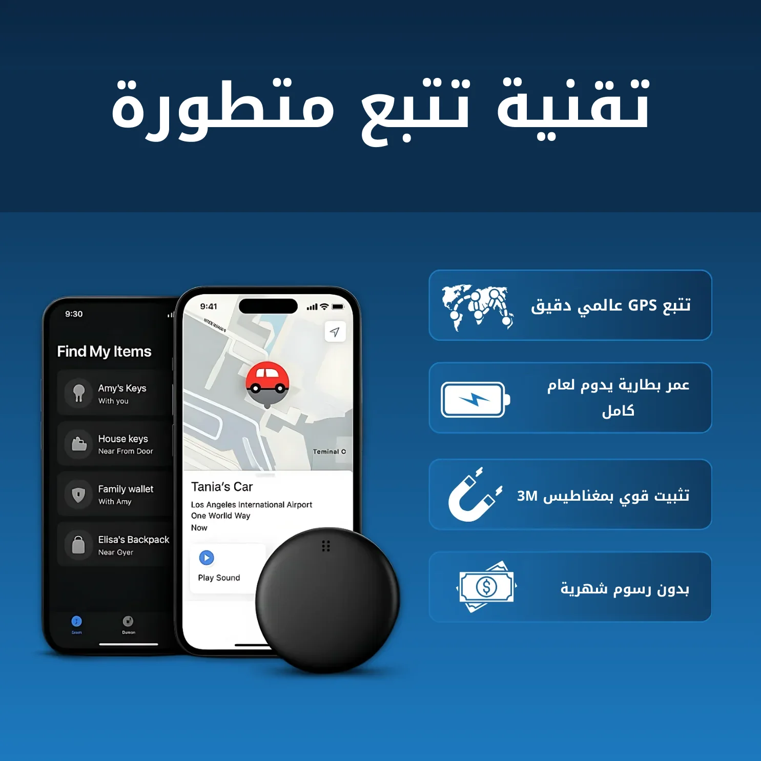 تابع كل ما يهمك أينما كان — من السيارات والدراجات إلى المفاتيح، المحافظ، والحقائب. بفضل تقنية GPS الدقيقة والتغطية العالمية، ستكون على علم بالموقع الحقيقي لمقتنياتك في أي وقت.